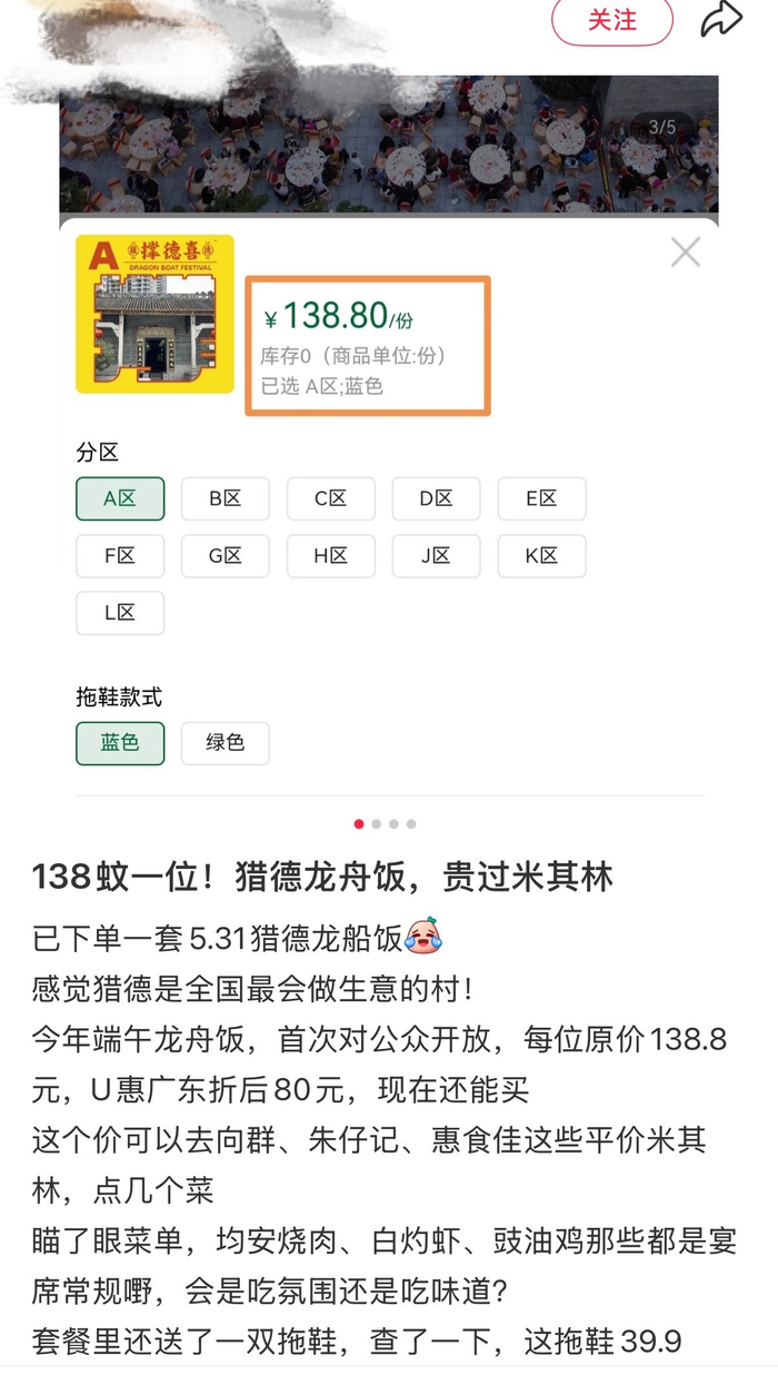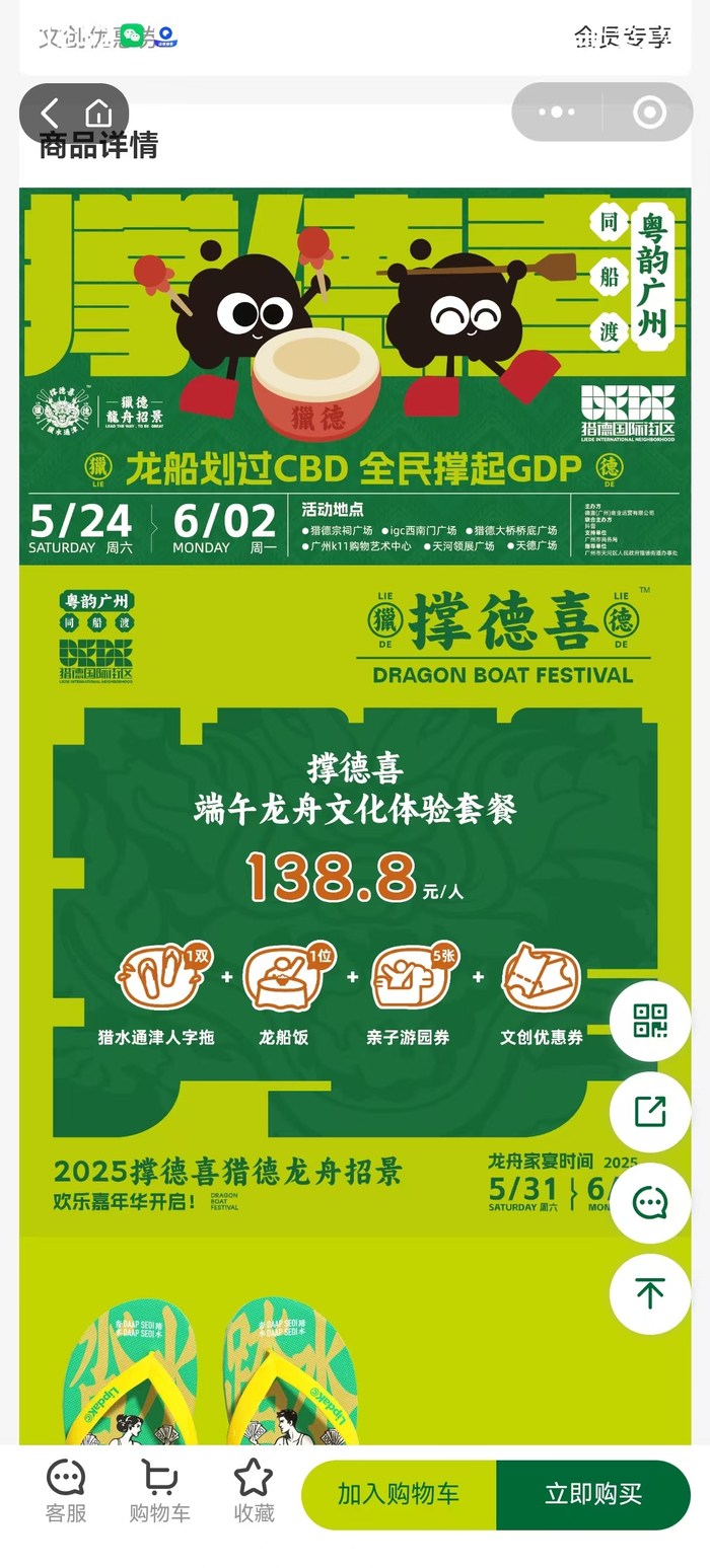 而德喜(广州)商业运营有限公司在公众号所发布信息显示,“龙舟招景及各分会场市集、嘉年华活动皆免费入场,参与千围龙舟饭活动需购买撑德喜端午龙舟文化体验套餐。”这份龙舟饭套餐标价为每人138.8元,另搭配人字拖、游园券等文创产品。且注明,活动指导单位为广州市商务局,配合单位为广州市天河区人民政府猎德街道办事处、猎德国际街区。
