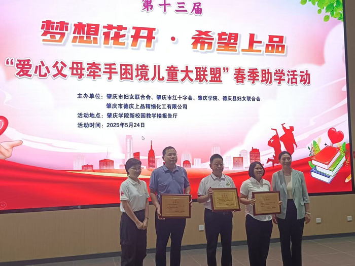 5月24日,由肇庆市红十字会、肇庆市妇女联合会、德庆县妇女联合会、肇庆市德庆上品精细化工有限公司联合主办的第十三届“梦想花开·希望上品”爱心父母牵手困境儿童大联盟2025年春季助学活动在肇庆学院举行,发放20.7万元春季助学金,惠及138名困境学生。
