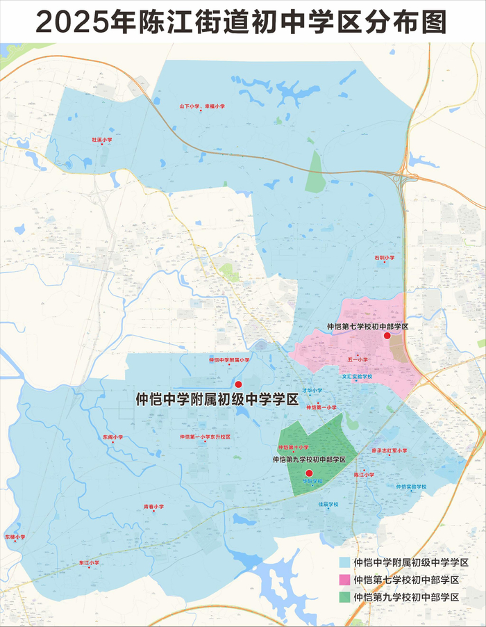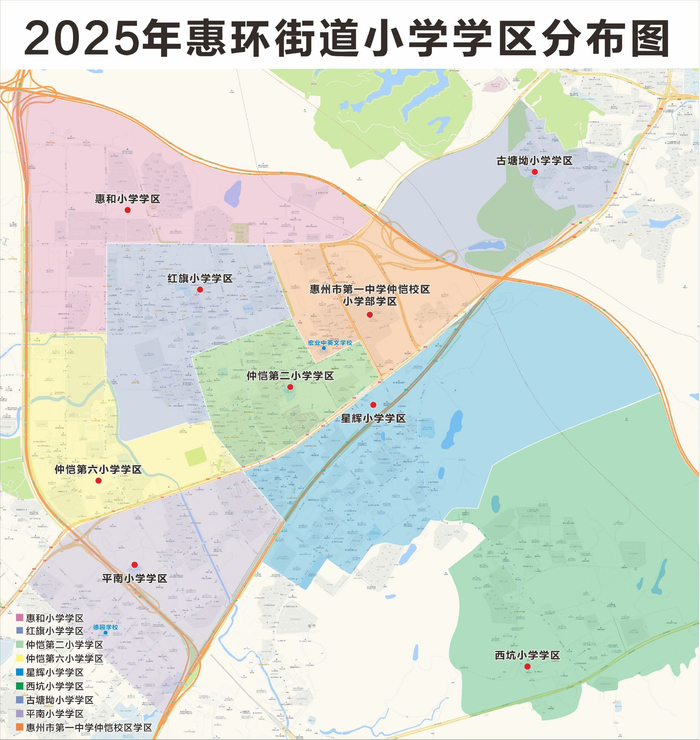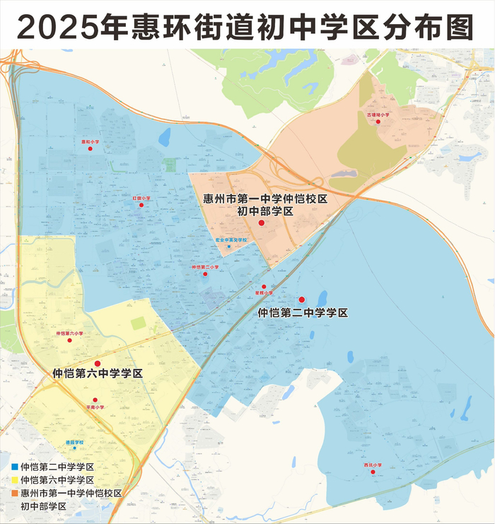 (二)学区划分小学招生不以毕业幼儿园为依据,与学生在哪所幼儿园毕业无关。初中招生不以毕业小学为依据,与学生在哪所小学毕业无关。例如学生甲在仲恺第一小学毕业,但其监护人目前的证件地址不在仲恺中学附属初级中学的学区范围,则其不能申报仲恺中学附属初级中学。再如,学生乙虽然不在仲恺高新区的小学毕业,但该学生的户籍地址在仲恺中学附属初级中学的学区范围,则其可以申报仲恺中学附属初级中学。各学校的学区范围见学区分布图。