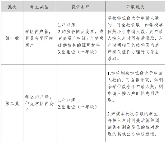 (一)招生批次公办学校招收区内户籍新生,按照批次先后顺序录取,具体批次如下: