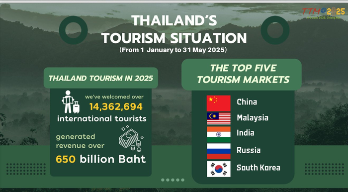日前,2025泰国旅游交易会(以下简称“TTM+2025”)在清迈举行。本次交易会汇聚来自全球53个国家和地区的优质旅游企业代表,通过专业高效的旅游业务洽谈会,搭建国际旅游合作平台。记者在活动期间从泰国国家旅游局获悉,2025年1月至5月,泰国接待国际游客超1436万人次,实现旅游收入逾6500亿泰铢(折合人民币约1432亿元),中国始终保持第一大客源国的地位。