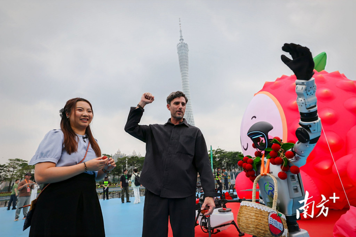 “送您新鲜的白糖罂!”6月6日下午,“6·6 给‘荔’节——广东荔枝全球品鲜嘉年华”在广州举行。活动现场,一个腰间系着一篮荔枝的人形机器人迎面走来,与前来参加活动的观众握手,热闹非凡。