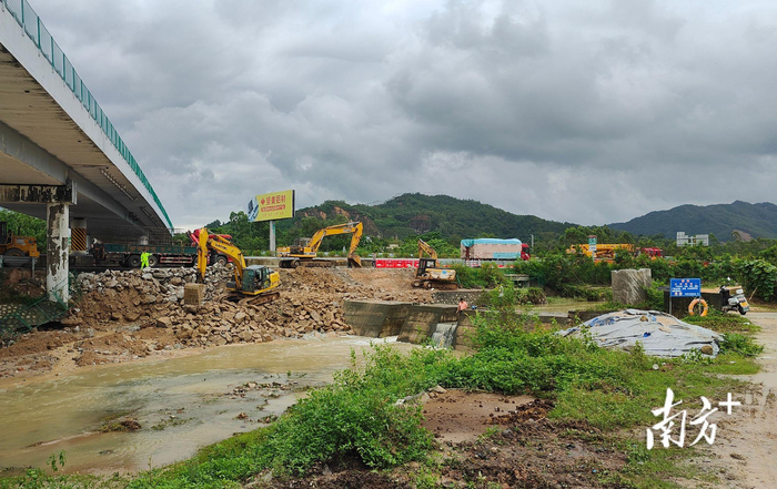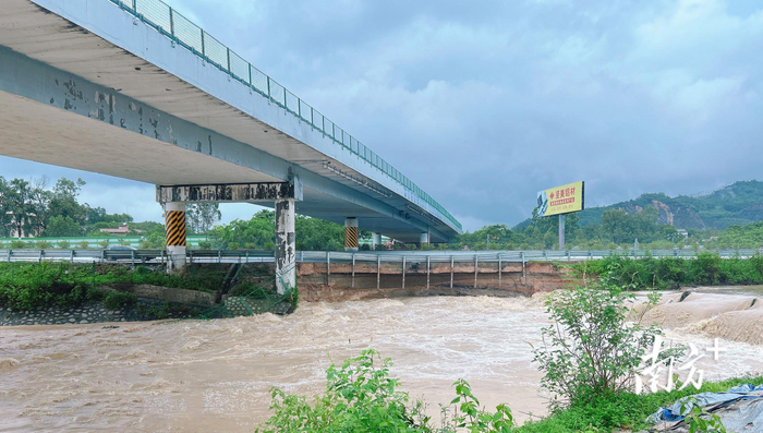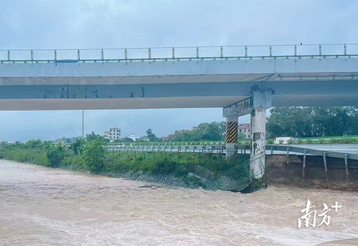 12时55分,棠芾村委会坡尾村村民小组长卓万全、卓长江带领网格员卓土坤、卓雨辉、卓超全、卓开文沿河巡查。行至沈海高速南门河大桥附近,对岸景象令众人心头一紧:高速公路边坡土石正被激流猛烈吞噬,路基裸露,一处深坑赫然可见,湍流不断冲刷着脆弱的堤岸。