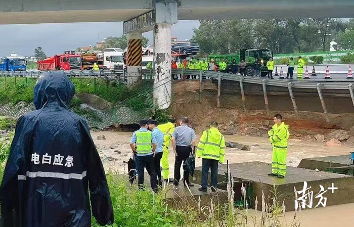 高速路上的逆行进行之时,观珠镇主职领导、驻村干部、市区交通部门专业处置队伍也陆续赶到现场,展开抢险。笔者了解到,17日当天,观珠镇应急办在接报后已及时将险情上报电白区三防办,涉事路段随后进行了更为妥善的封锁引导,并制定临时修补方案。到目前,路基部分已完成了加固和修补,后续则需要高速公路管理部门全面评估风险和处理修复。