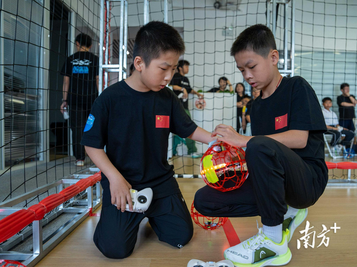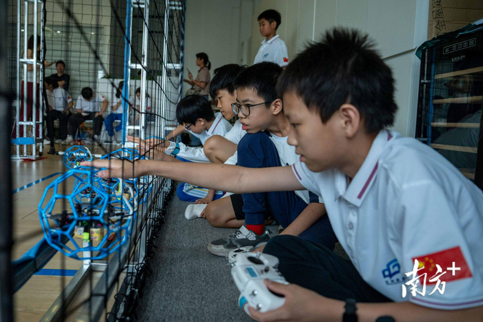 5月18日,深圳宝安某科技园,比赛即将开始,东莞长安实验小学航模队员将无人机足球放入比赛区域。深圳市宝安区全至科技创新园体育馆内,一场充满未来感的空中对决正在上演——红蓝两队各5名队员手握遥控器,指挥着外罩20厘米镂空防护架的四轴竞速无人机展开攻防。