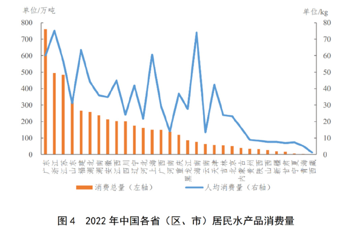 从人均消费量看,沿海省份普遍高于内陆省份。浙江、海南、福建上海、广东的人均水产品消费量位列全国前5,分别是75.19kg、73.95kg、63.35kg、60.64kg、60.15kg。