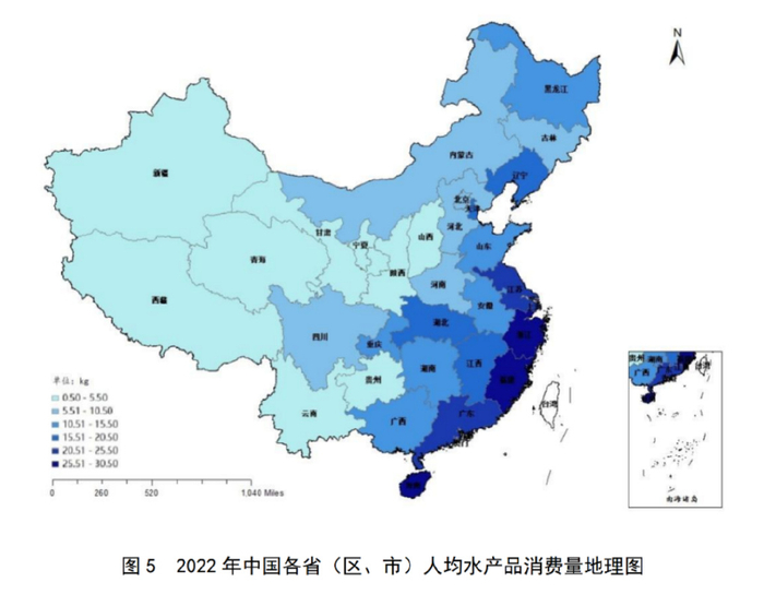 内陆省份中,长江流域省份高于其他省份。长江流域的重庆、湖北、湖南、安徽和江西人均消费量在35kg以上,而其他内陆流域省份人均消费量均小于22kg。