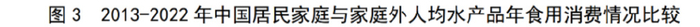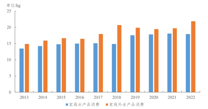 家庭和家庭外消费量比较根据就餐场景,我们将居民水产品消费划分为两个主要方面:家庭内消费和家庭外消费。2022年居民水产品人均家庭消费量为13.9kg,折算鲜重后为17.89kg,家庭外消费鲜重21.86kg。这两者在整体消费中的比例保持相对稳定,其中家庭消费占全部水产品消费的45%,而家庭外消费占比55%。
