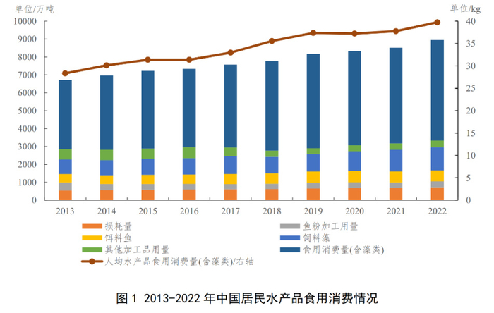 在2022年,人均食用水产品消费量达到了39.75千克(含藻类的鲜重),较2013年的28.34千克增长了33%。