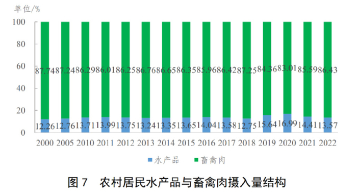 2022年城镇居民人均水产品消费量达到了《食物与营养基础研究报告》目标和“膳食宝塔”的中值目标,达标率分别为103.63%和103.69%。农村居民人均水产品消费量一直低于两个推荐标准。