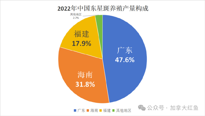 但是由于东星斑名气太大、吃客众多,现在市场上野生的东星斑越来越少,因此近几年国内兴起东星斑养殖。数据显示,2022年中国石斑鱼养殖产量205,816吨,其中广东养殖产量97,937吨(47.6%),海南养殖产量65,437吨(31.8%),福建养殖产量36,895吨(17.9%),三省合计占全国石斑鱼养殖产量97.3%(见下图)。