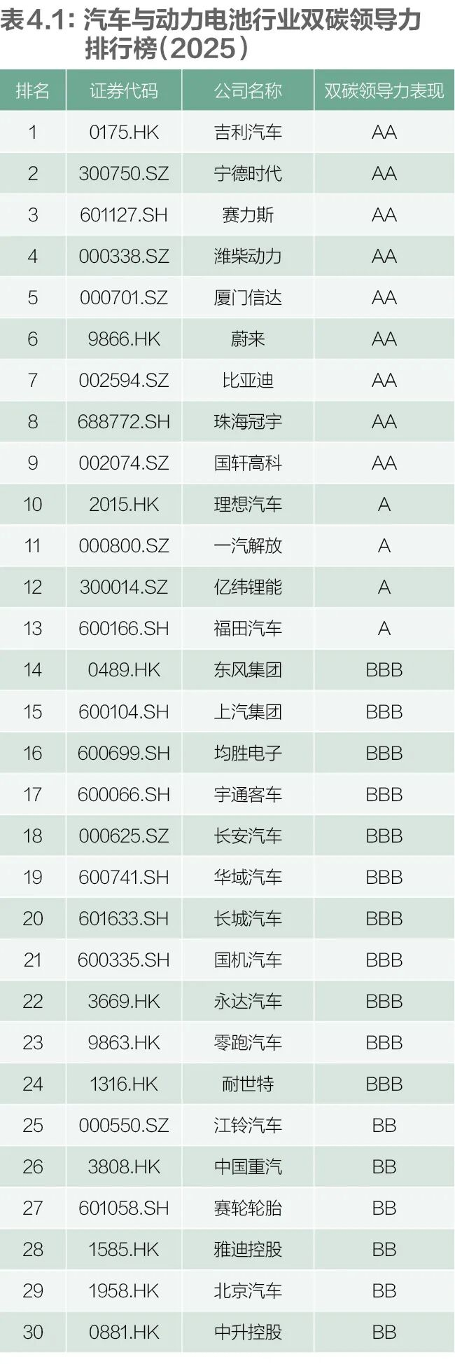 2025年榜单中,30家上市汽车与动力电池企业双碳领导力表现大致均衡分布,13家企业获“A”及以上等级,较上年增加12家;11家获“BBB”级,较上年增加4家。所有参评企业均达“BB”及以上等级,行业低碳努力取得一定成效。
