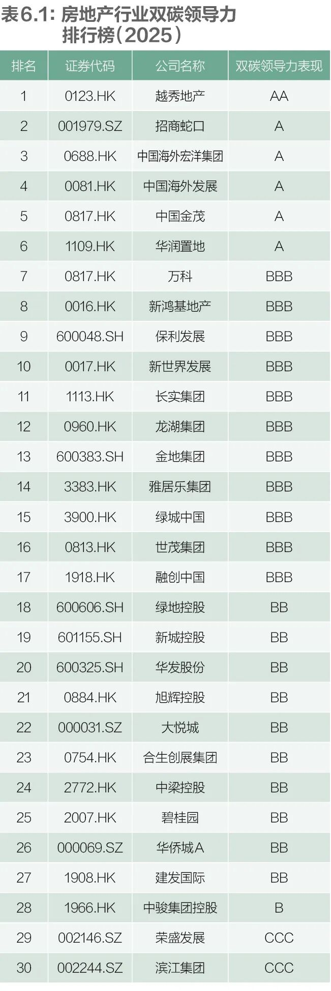 分议题看,行业在气候治理与风险识别方面整体进步显著,气候双碳治理议题和气候风险识别与管理平均得分显著提升;供应链协同不足,27家企业对供应商提出绿色环保要求,但仅10家涉及低碳标准;能源绩效与碳排放目标披露缺乏统一标准,主观性强、可比性差的问题依然突出。整体而言,房企双碳实践已从“有无问题”转向“质量问题”,未来的关键在于从建立框架转向深化执行,并着力解决目标不可比、绩效不可量、价值链带动不实等结构性短板。