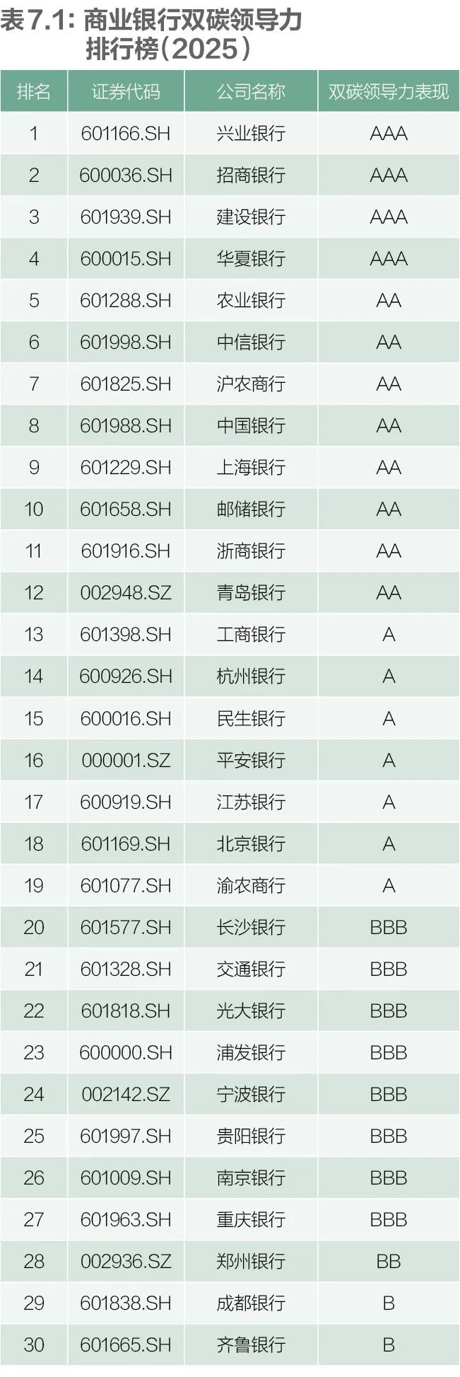 2025年榜单中,30家上市商业银行行业整体表现显著提升,保持领先其他行业。各企业综合得分平均提升约18.12分,整体符合“头部引领、中部追赶、尾部提升”的行业格局。以兴业银行、招商银行、中信银行等为首的19家银行获评“A”及以上等级,较上年净增15家;长沙银行、宁波银行等8家银行获评“BBB”等级,较上年减少8家。去年龙头企业工商银行今年相对位次回落较大,但仍保持A级评级;成都银行、郑州银行等尾部机构因双碳基础薄弱且缺乏有效提升措施,持续处于行业末端。