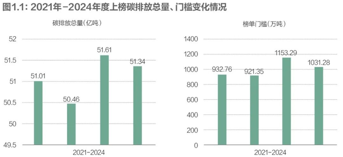 2021年-2024年,百大碳排放上市公司的排放总量在2023年达到51.61亿吨的峰值,2024年再次出现回落,同时,榜单门槛在2023年达到1153.29万吨的峰值,2024年与碳排放总量同步回落,数据说明中国碳排放前100家上市公司碳排放可能已接近达峰。2021年至2023年排放总量从51.01亿吨增至51.61亿吨,年均增速约0.59%,而2024年转为-0.52%,凸显双碳政策的深化见效与企业减排行动的加速。