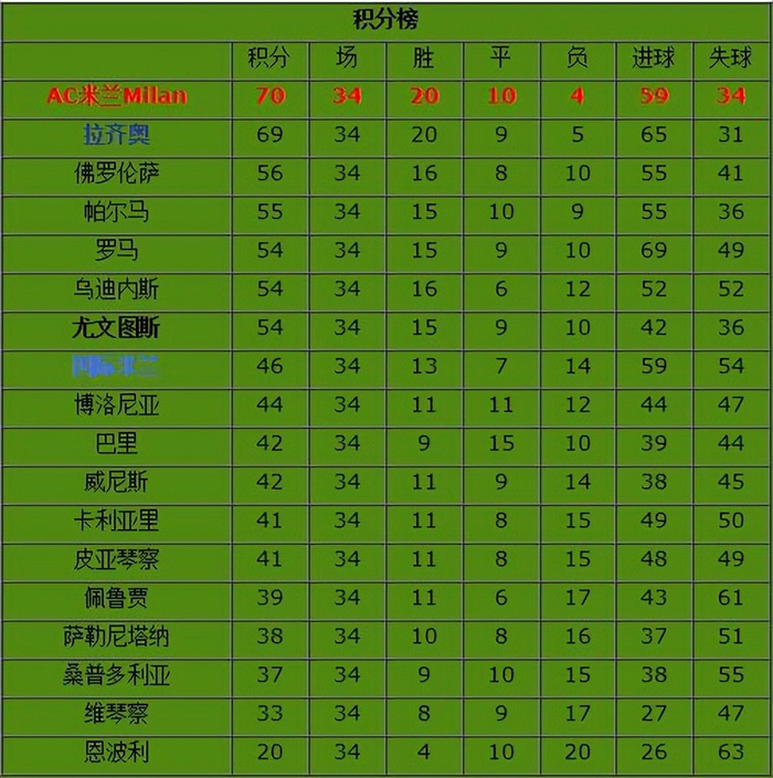 AC米兰以20胜10平4负积70分的战绩,领先拉齐奥1分,夺得队史第16座意甲联赛冠军。米兰打入59球,攻击力排在罗马和拉齐奥之后,位列第三。失球34个,仅多于失31球的拉齐奥。