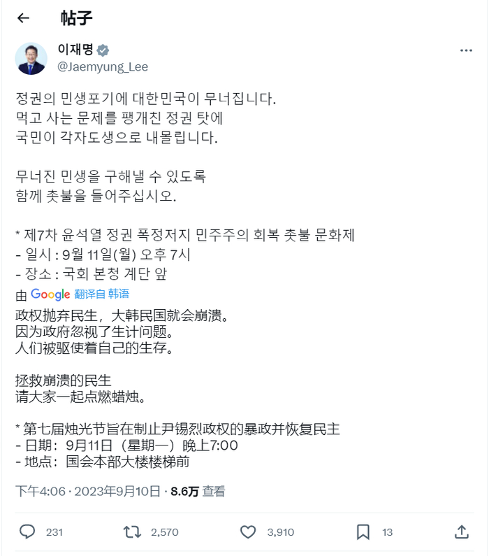 8月23日,李在明先是率领自己的政党举行烛光集会,要求日本政府撤回核污水排海计划,同时强烈谴责韩国政府的消极应对。