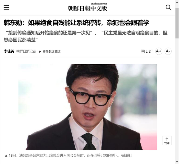 同时,韩国舆论中也出现了批评的声音,指出绝食行动只会将政治推向极端。