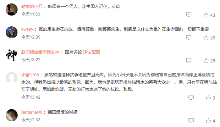 由于在抗议日本强行排放核污染水问题上的一致看法,李在明的举动在中国国内得到了很多网友的尊重,这一话题在18日冲上微博热搜第二的位置,不少人对李在明的决心表示敬佩。