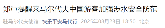 近期接连发生中国游客在马尔代夫不幸溺亡案件,令人痛心。驻马尔代夫使馆郑重提醒赴马中国游客珍爱生命,安全至上。敬畏自然和异国特殊水域环境,始终将人身安全放在首位,选择适合自己身体状况、年龄的涉水活动。