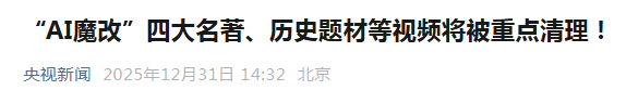 为整治“AI魔改”视频传播乱象,国家广播电视总局自2026年1月1日起,在全国范围内开展为期一个月的专项治理。