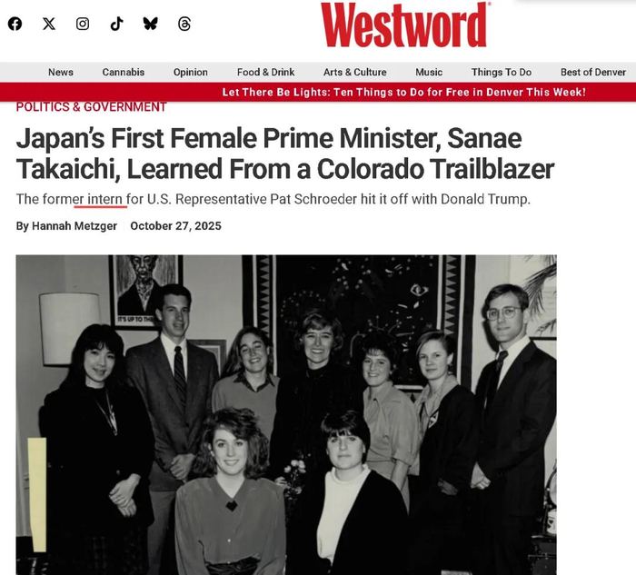 这里还有一个相当讽刺的小插曲。当今年10月高市当选日本首相的消息传到了美国时,在她当年实习服务过的施罗德议员的老家科罗拉多州,当地新闻媒体《WestWord》曾专门出了一篇文章,介绍了她当年在施罗德处的经历。尽管此文的初衷是想谈论美国政治对日本政治的影响,却在无意间印证了高市当年就是一个实习生(Intern)。