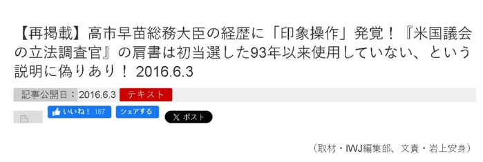 后来,到了2016年时,已经成为了日本时任首相安倍晋三内阁重要成员的高市,再次因为当年的这个假头衔引起了日本媒体的关注。当时,不仅有日本媒体扒出她在美国时的履历只是个无薪的实习调研员,有媒体记者甚至怀疑,她的工作不过是复印文件、端茶倒水这类杂务。