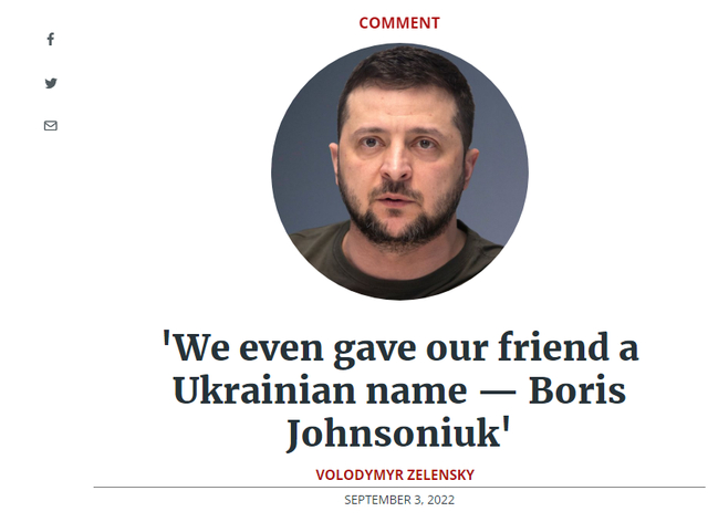 【环球网报道 记者 索炎琦】“我们甚至给我们的朋友取了一个乌克兰名字——鲍里斯·约翰逊纽克。”英国《每日邮报》当地时间9月3日以此为题刊载乌克兰总统泽连斯基署名文章,泽连斯基在文中赞扬约翰逊及其政府对乌克兰的“坚定支持”,同时提到乌克兰人给约翰逊起了“乌克兰名字”——“鲍里斯·约翰逊纽克”。