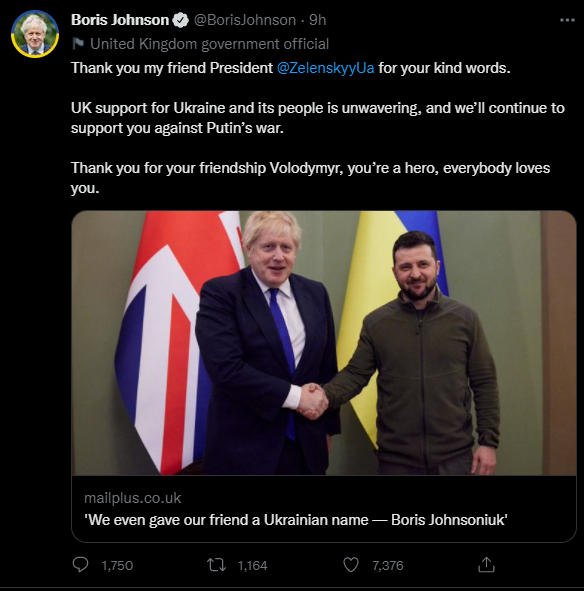 文章最后,泽连斯基再次发出赞扬,称乌克兰和英国是“真朋友”,“就像他和他的朋友鲍里斯(约翰逊)那样”。