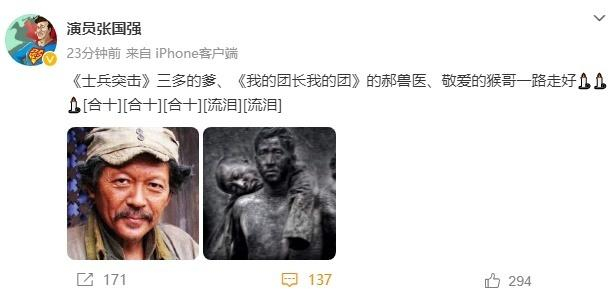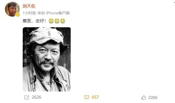 演员刘天佐、张国强等人发文悼念,“兽医,走好”,“《士兵突击》三多的爹、《我的团长我的团》的郝兽医、敬爱的猴哥一路走好”。