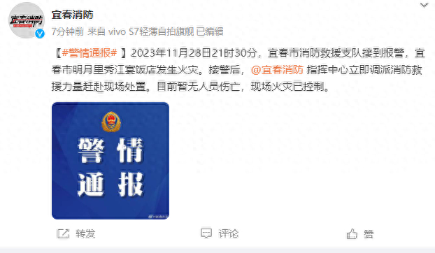 2023年11月28日21时30分,宜春市消防救援支队接到报警,宜春市明月里秀江宴饭店发生火灾。接警后,@宜春消防指挥中心立即调派消防救援力量赶赴现场处置。目前暂无人员伤亡,现场火灾已控制。