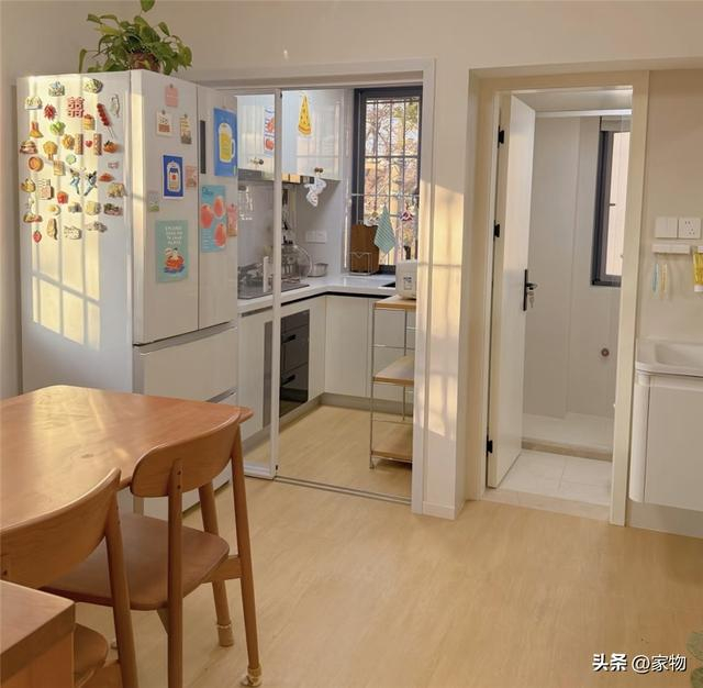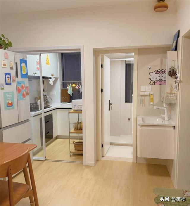 - 若分成三个空间的话,进门处便是家中的第一个空间,容纳下餐厅、厨房和卫生间,正如我上面所讲,没有玄关,而是将转角空间留给洗手台,用起来倒是方便。