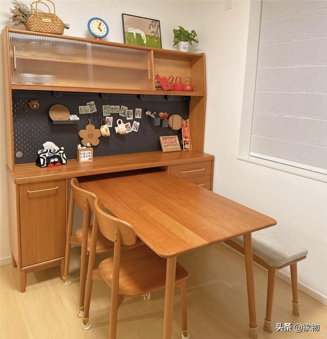 但话又说回来,毕竟家里空间较小,想要放上一张哪怕是一米六的餐桌也很勉强,只好利用餐边柜内收的设计,在平时将桌面塞入餐边柜底部进行收纳,日常一家三口吃饭空间足够,家里来人做客抽出来也能坐下更多的人。