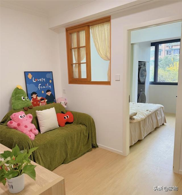 床头和客厅中间的隔断墙上,掏出了一个方形的内窗,一方面,它可以避免影响光线和空间通透感,另一方面,也算是增加了额外的采光和通风性,哦对还有,让次卧室显得多了几分田园气息。