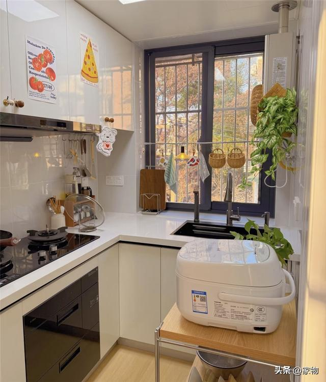 厨房差不多有3㎡左右,搭配一个放厨电的收纳架,变成了U形格局,各种厨电厨具嵌入柜子里,台面转角处也留出了一个小小的切菜备菜空间,虽然很紧凑,但一间厨房该有的功能它倒是也都有。