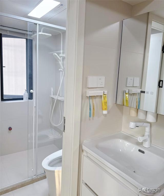 之所以要将洗手台外移,主要也是因为卫生间内实在太小,想做浴室的话只好如此,说起来也算是半个“三分离”式格局了,洗漱如厕沐浴互不打扰,一家三口生活的话,用起来真的非常舒适。