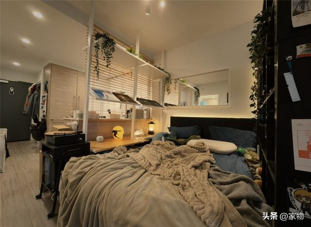 将卧室搬到客厅里,最大的问题就是四周空空荡荡地,睡眠没有安全感,为了解决这个问题,他在厨房一侧用通顶架子搭配百叶窗,将床铺与厨房隔断开,床头的镜子更是增加了一种延伸感,让视觉上空间更显宽敞。