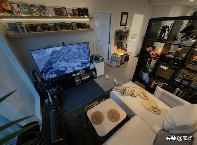 不仅在上面装两层收纳架来放各种游戏光盘,还增加了底光用作展示;电视底部更是手拿着机顶盒、游戏机等物,看起来乱中有序,有种杂货铺风格的美感。