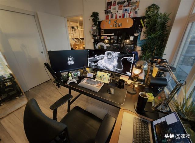 电脑桌设计成半包围式格局,面前屏幕足够大,旁边采光足够强,甚至还有一个放笔记本的地方,无论是办公还是玩游戏,效率都很高。