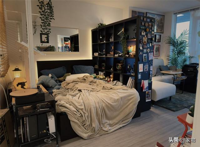 原本,放床的这位置也是客厅的空间,但如今,却用一道黑色的开放式高柜隔开,柜子上放着他喜欢的各种玩具摆件,下面也可以收纳书籍杂物,甚至可以专门留出柜格,当个睡前放水杯、手机等物的床头柜,也是颇为实用。