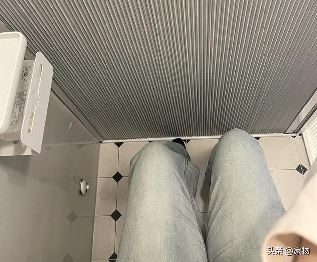 隔断的长度刚不到一米,人坐在马桶上虽然显得有些拥挤,但腿部到折叠门也还有半拳的距离。