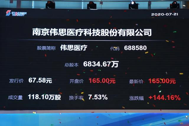 伟思医疗开盘价为165元,较发行价上涨144.15%;收盘价为181元,较发行价上涨167.83%。以收盘价计算,伟思医疗市值为123.71亿元。