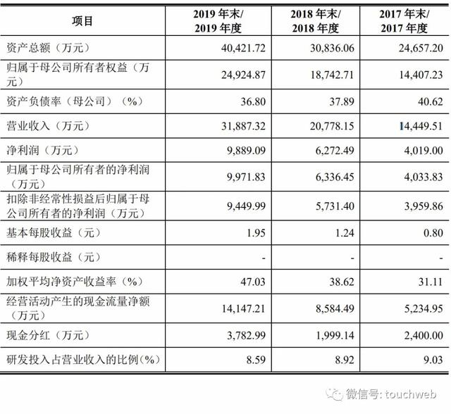 伟思医疗2017年、2018年、2019年营收分别为1.44亿元、2.08亿元、3.19亿元;净利润分别为4019万元、6272万元、9889万元。