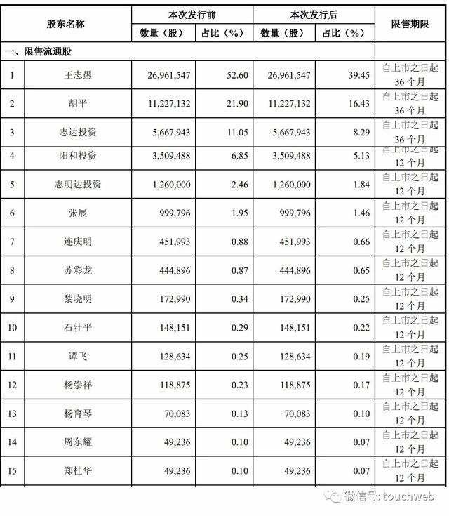 IPO后,王志愚持股为39.45%,胡平持股为16.43%,志达投资持股为8.29%,阳和投资持股为5.13%。