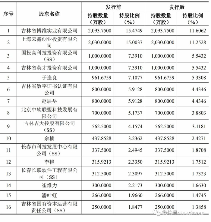 IPO前,吉林省博维实业有限公司持股为15.4749%,蚂蚁集团旗下上海云鑫创业投资有限公司持股为15%,国投高科技投资有限公司(SS)、吉林省英才投资有限公司分别持股为7.3910%;