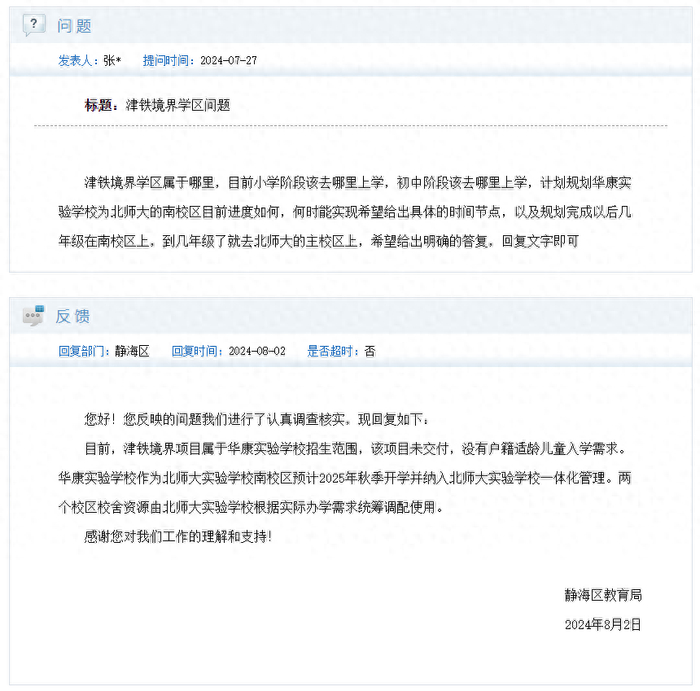 静海区教育局回复:目前,津铁境界项目属于华康实验学校招生范围,该项目未交付,没有户籍适龄儿童入学需求。华康实验学校作为北师大实验学校南校区预计2025年秋季开学并纳入北师大实验学校一体化管理。两个校区校舍资源由北师大实验学校根据实际办学需求统筹调配使用。