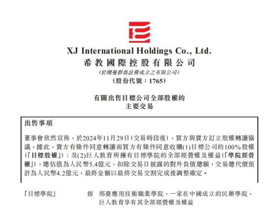 据澎湃新闻报道,为筹措资金,有效地化解债务,11月29日,全国第二大的民办高等教育集团希教国际控股有限公司出售邢台应用技术职业学院,扣除交易日披露的对外负债总额,交易总代价预计为人民币4.2亿元。