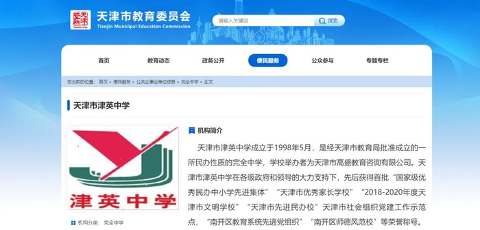 图源:天津市教委天津市教委网站显示,美达菲津英中学的前身天津市津英中学成立于1998年,位于南开区黄河道494号,是一所民办性质的完全中学。