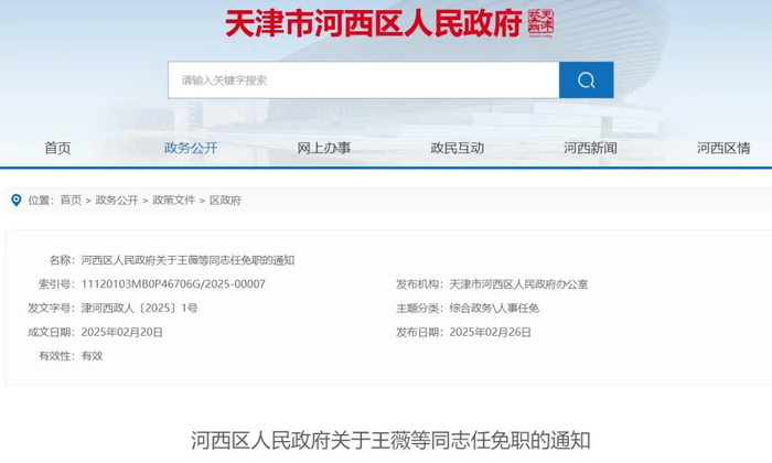 王薇同志任河西区人民政府桃园街道办事处主任;