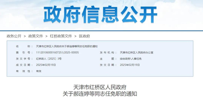 郝连婷任红桥区教育局副局长(试用期一年),免去其天津市第三中学副校长职务;